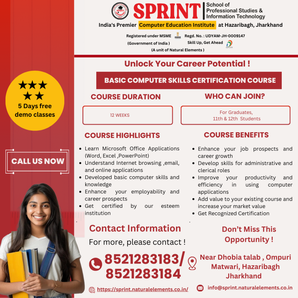 We are pleased to announce the opening of admissions for the Basic Computer Skills Certification Course in Computer Application at RNYM College Barhi, and at our corporate center of SPRINT at Matwari Hazaribagh